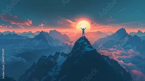 A lone figure stands on a mountain peak, arms raised in victory, as the sun rises over a majestic mountain range. Generative AI