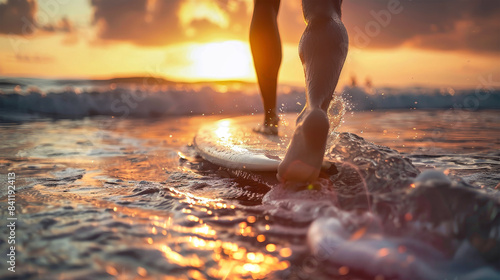 A surfer walks towards the shore on their board, the setting sun casting a warm glow on the water