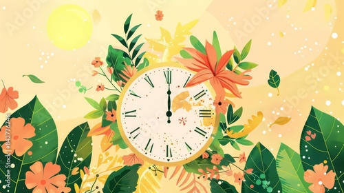 Clock surrounded by colorful flowers and leaves, representing the passage of time and new beginnings.