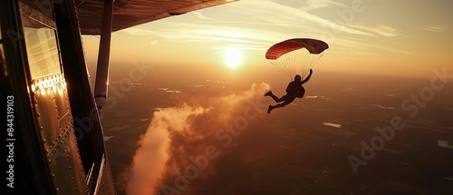 AI generator image of Create a visually captivating image that embodies the sheer courage and exhilaration of parachuting from an airplane. Picture a vast, open sky,