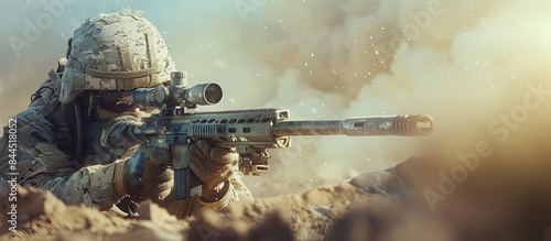 A soldier in full gear taking aim with a sniper rifle in a desert-like environment, showcasing military precision and focus in action.