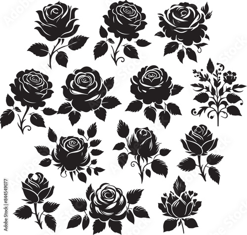 Set of decorative rose with leaves. Flower silhouette. Vector illustration