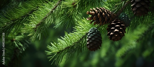beautiful bunch of fir cones on a green branch. Creative banner. Copyspace image