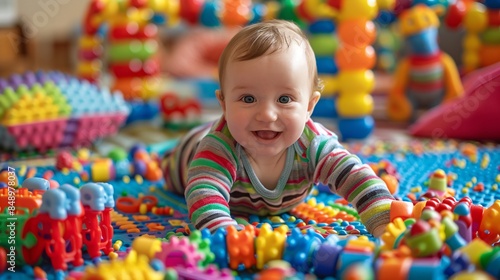 Colorful children's toys scattered on a playmat with a baby playing happily