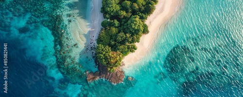 Drone view of a picturesque island with white sandy beaches in bright day, turquoise waters, and a coral reef surrounding it, creating a perfect paradise for vacationers and nature lovers
