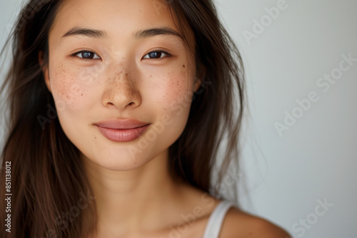 Young asian woman proudly shows off her natural beauty, with stunning freckles and flawless skin, exuding confidence and positivity with her radiant smile and fresh makeup