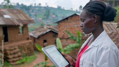 African female doctor in a white coat, holding a tablet displaying health data, reads intently in a rural village setting.