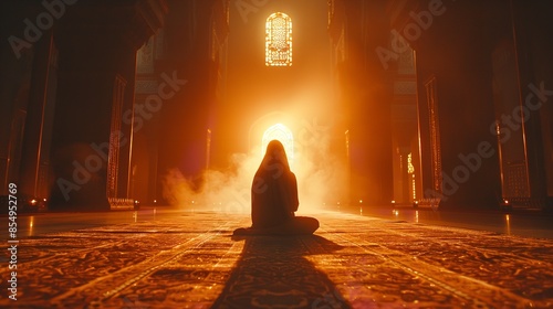 A silhouette of a person kneeling in a dimly lit temple interior, bathed in a soft, golden light emanating from a window above