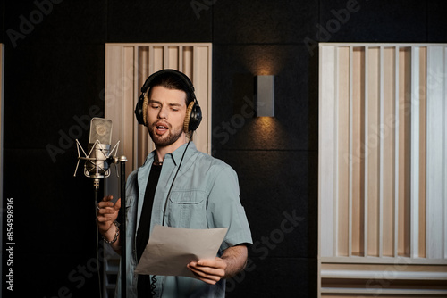 A man passionately sings in a recording studio during a music band rehearsal session.