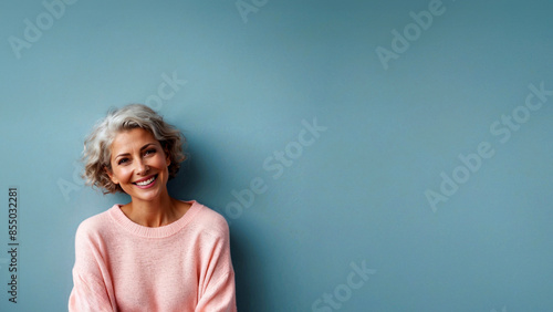 smiling woman in menopause age in pink sweater over a light blue background with copy space