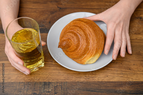 Jeść słodkie śniadanie, crossaint i sok jabłkowy na stole, widok z góry