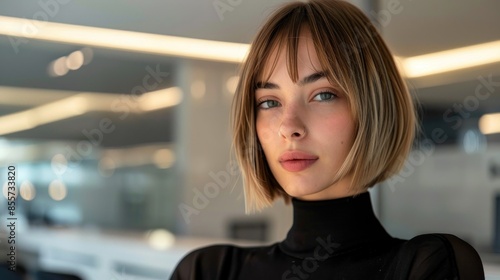 A woman with a stylish bob haircut, featuring sharp, clean lines and a sleek finish. The photo highlights the precision and sophistication of the hairstyle. The background is a modern, well-lit salon