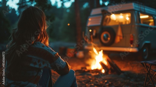 A female rest with camper van in wilderness camping site with camp fire at night.