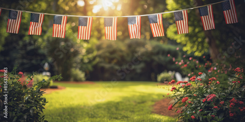 American flag banner decorating a green grass backyard on a sunny day