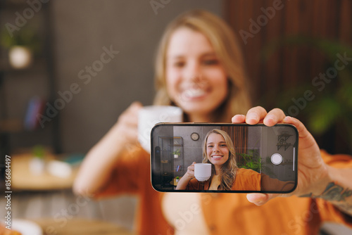 Young woman wear orange shirt do selfie shot on mobile cell phone drink coffee sits at table in coffee shop cafe relax rest at restaurant in free time indoor. Freelance mobile office business concept
