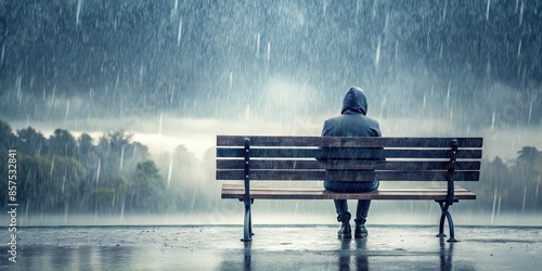 Lonely person sitting on a bench in the rain, lonely, sorrowful, melancholy, despair, depression, gloomy, desolate, heartbroken, unhappy, somber, isolation, gloom, dejected, forlorn, moody