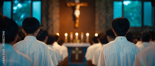 Scene of a church service with priest delivering a sermon about the significance of saints, congregation listening and reflecting, candles illuminating the space
