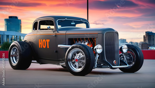 beautiful old timer hot rod vintage matte black car at sunset, transport and vehicles, automotive background, orange word hot on side doors