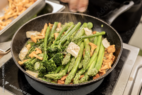 smażenie warzyw na patelni kurki, szparagi - w trakcie mieszania