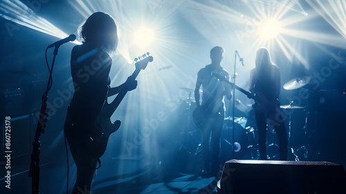 Music band of four people two women two men performs on stage focus on left woman : Generative AI