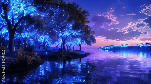 The bioluminescent trees around the lake emanate a delicate glow, creating an extraordinary, luminous scenery that delights and calms all who admire it.