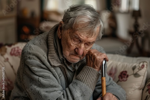 An elderly man sits on a couch, looking sad and lonely. He is holding a cane in his hand. The photo is taken from a low angle, making the man look even more vulnerable.