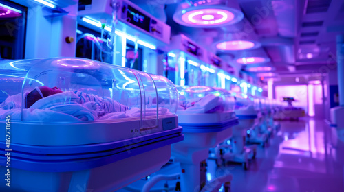 Neonatal Intensive Care Unit with Incubators. Neonatal intensive care unit with multiple incubators under blue and purple lighting, highlighting advanced medical care for newborns.