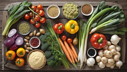 Sustainable plant-based proteins, fiber-rich whole grains, and antioxidant-packed produce beautifully presented on a eco-friendly wooden table, embodying a nutritious and conscious culinary experience
