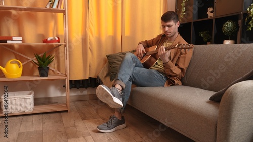 #610738126Young male patient getting an intravenous vitamin treatment at home. Happy, relaxed man with an IV drip needle in his vein sitting on a comfortable couch in the living room. Vitamin therapy concept
