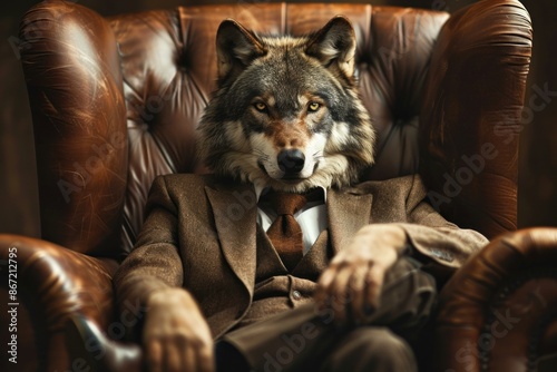 Powerful businessman wolf wearing suit sitting in leather chair