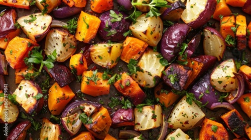 A sheet pan of roasted root vegetables drizzled with avocado oil and tossed with savory herbs.