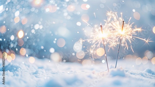 two burning sparklers in snow, empty nature party background for christmas or New Year's Eve, blurred winter backdrop, fireworks in snow landscape, celebrate for two, concept with copy space