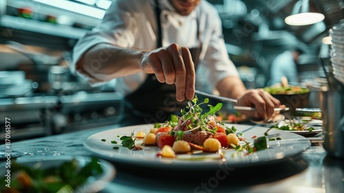 Chef preparing delicious dishes in a high-end restaurant By emphasizing the intricate details of the food.