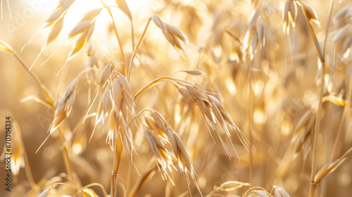 A close-up image captures the delicate beauty of oat spikes, illuminated by the soft, warm glow of morning sunlight