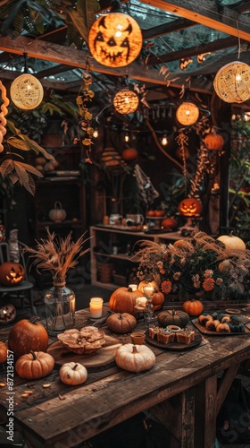 Halloween scary scene with spider web, pumpkins and other fall decorations.