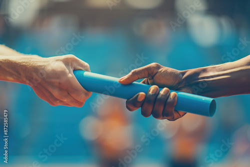 Passing the Relay Baton. Close-up of two hands passing the baton in a track and field race, A blurred background of a sports stadium