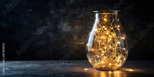 Vase with fairy lights inside on black background seen from above abstract texture , vase