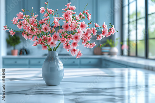 White Marble Countertop with Blurred Blue Kitchen Cabinets and Flowers Background, Modern Interior Design