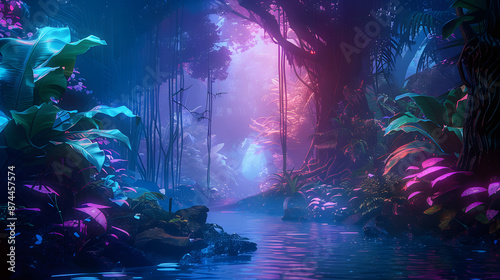 Magic forest with blue and purple neon colors and glowing. Mysterious pathway in the jungle.