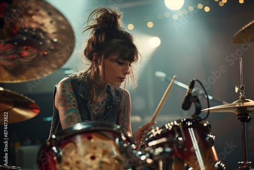 Professional drum set closeup. Beautiful young tattooed woman drummer with drumsticks playing drums and cymbals, on the live music rock concert or in recording studio. Female drummer.