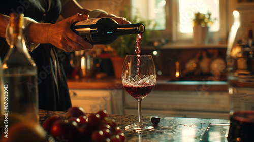 Une femme élégante verse une bouteille de vin rouge dans un verre de cristal dans sa cuisine