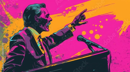 CEO silhouette delivering a business speech, pop art comic style, vibrant and dynamic, retrofuturism theme, neon colors, high contrast