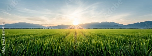 Scenic view of a Japanese countryside with rice fields and mountains, late afternoon sunlight, ample copy space