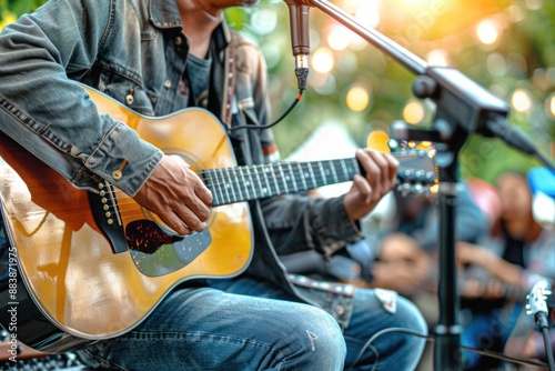 A man sitting play acoustic guitar on the outdoor concert with a microphone stand in the front, musical concept