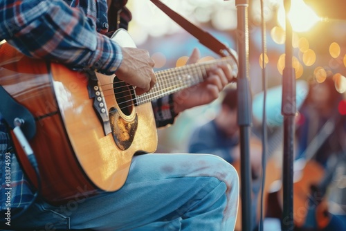 A Close up side view man sitting play acoustic guitar on the outdoor concert with a microphone, musical concept