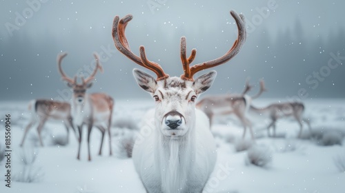 Young deer in winter forest. Deer in winter snow storm. Beautiful dear in a snowy forest. Dears in winter / Dear in snow. Reindeer Christmas decorative item isolated on white background Clipping path