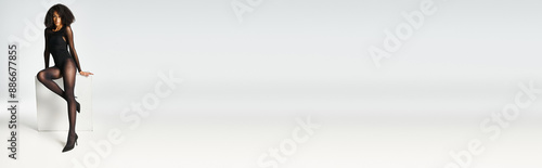 A young African American woman, clad in a sleek black bodysuit, strikes a pose against a grey studio backdrop.