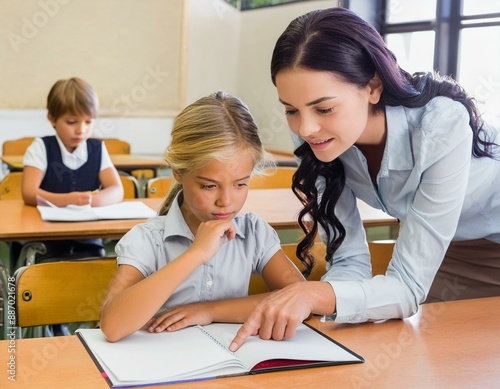 Nauczycielka wskazująca coś palcem w książce i tłumacząca uczennicy jakieś zagadnienie. Motyw nauki i nauczania w szkole podstawowej, początku roku szkolnego