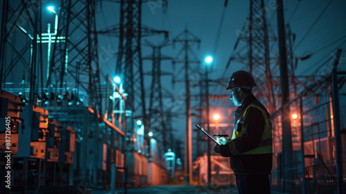Industrial electrician in safety gear using a tablet to check operations at a power plant with high-voltage towers at night.