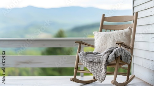 A rustic rocking chair on a porch overlooking a mountain landscape.